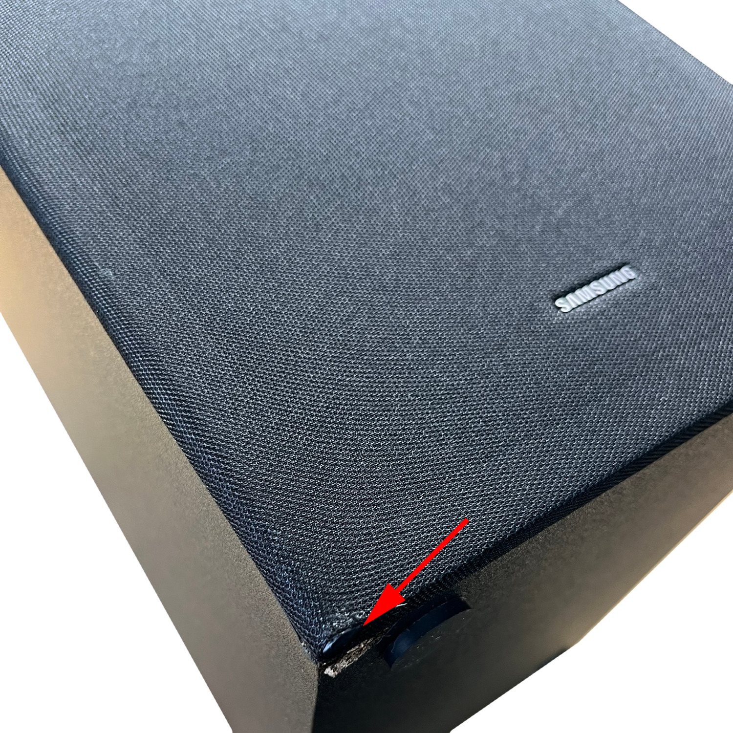 SUBWOOFER HAS A SMALL TEAR IN THE GRILL CLOTH AND DENT UPPER & LOWER LEFT CORNER. SEE ADDITIONAL PHOTOS ABOVE
