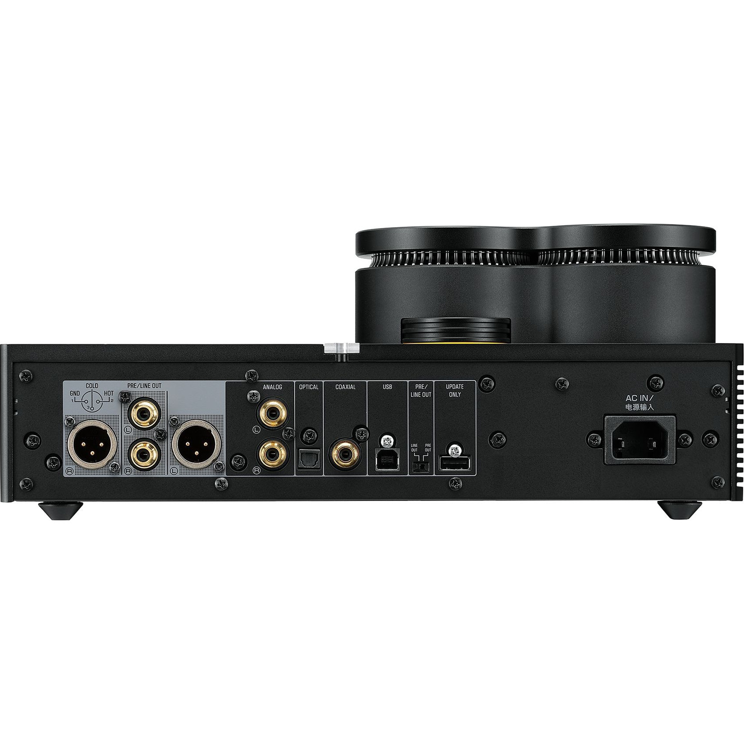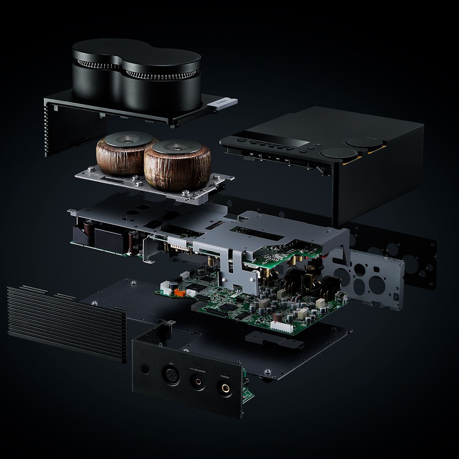 Following traditional audio principles and maintaining a low center of gravity, the two toroidal transformers are mounted on the main frame and represented in the unique external design, invoking an impression of fine modern architecture. Furthermore, thanks to a vertical three-dimensional structure, the transformer is located immediately above the power supply board, minimizing the power supply path, contributing to a design that delivers both high sound quality and a very cool cosmetic.